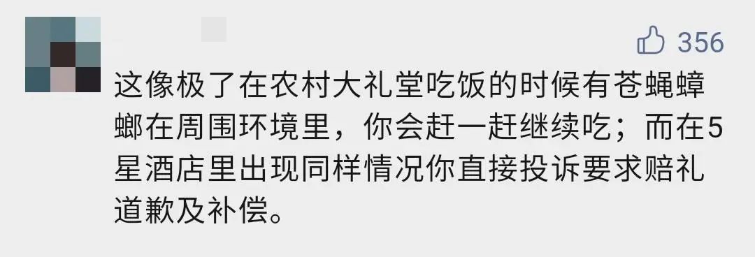 苍蝇馆子吃出苍蝇,忍忍算了;五星级酒店就算只有苍蝇飞,投诉到底。