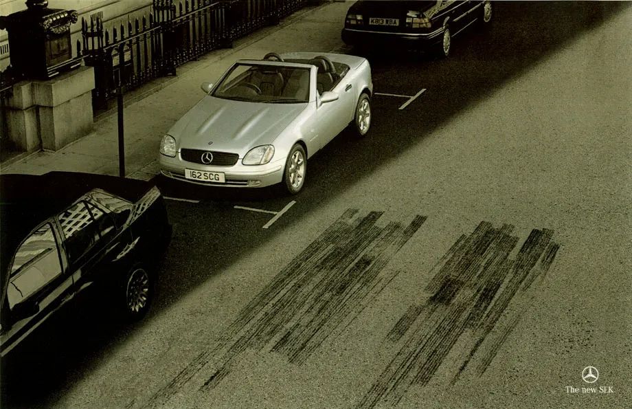 多年前向一位客户提案,那是一个非常奇异的想法,客户听罢当即表示很喜欢。客户负责人是一位金融界高管,他说:“我是全国奥数的冠军,但我也很喜欢广告,真的好羡慕你们的想象力!”这也许是恭维之言,但想象力确实是一种天赋。Witty,即妙想源自于毫无关联的事物,被你找到连结点,利用想象力将两都绑起来,赋予一个全新的意义。譬如这则被奉为经典的平面广告,把几组刹车痕跟一辆奔驰新款SLK联系在一起,瞬间产生联想,新车令人瞩目、驻足的意味跃然纸上。