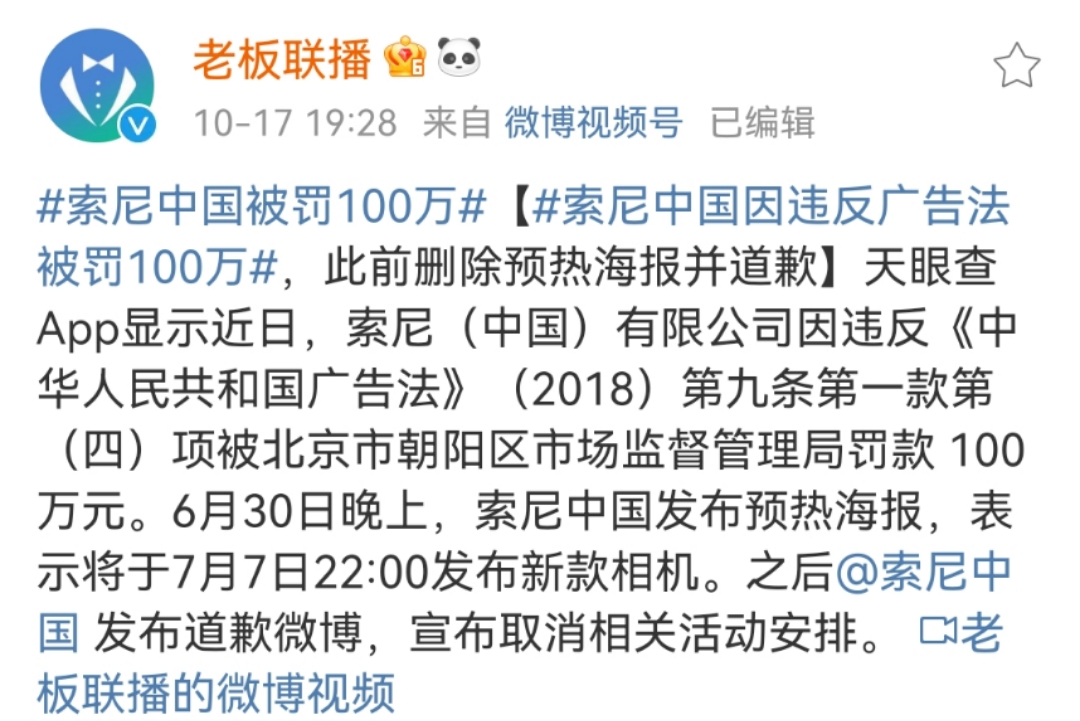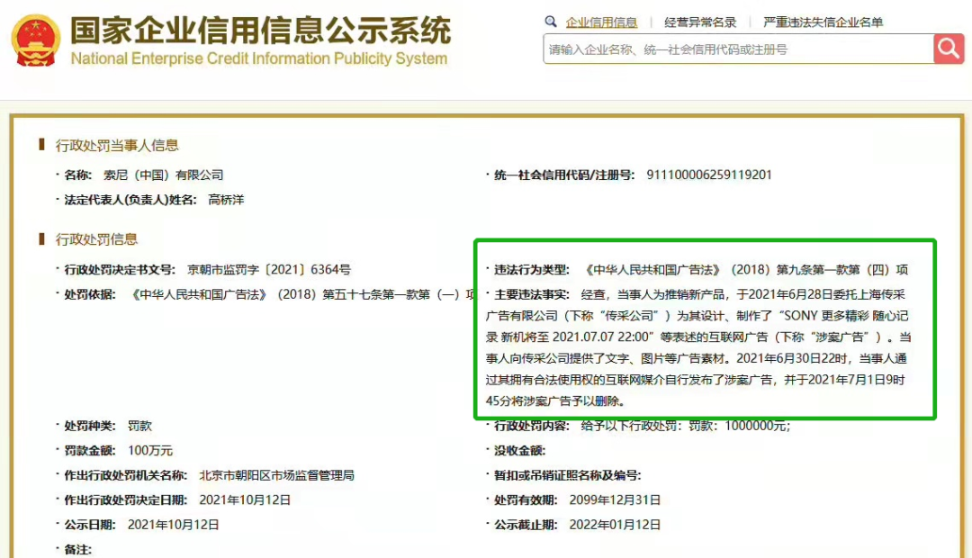 报道中称索尼(中国)有限公司因违反《中华人民共和国广告法》 第九条第一款第(四)项 :损害国家的尊严或者利益,泄露国家秘密。 被北京市朝阳区市场监督管理局罚款100万元。