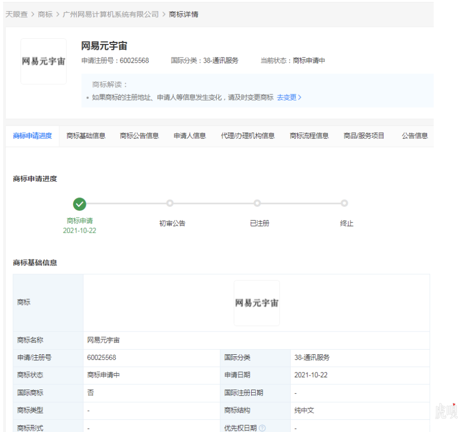 11月2日,据天眼查显示,网易(杭州)网络有限公司、广州网易计算机系统有限公司等多个网易关联公司近日申请注册“网易元宇宙”“雷火元宇宙”“伏羲元宇宙”等商标,国际分类涉及广告销售、教育娱乐、网站服务等,当前商标状态均为申请中。天眼查数据还显示,目前已有400多家企业申请了元宇宙相关商标。
