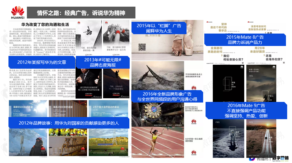 2012年开始,华为就力图用企业形象广告与用户谈心,无论是“无限可能”的品牌态度海报、经典的“烂脚”广告,还是Mate8和Mate9弱化产品的品牌TVC和态度海报,都传递着华为的世界观。