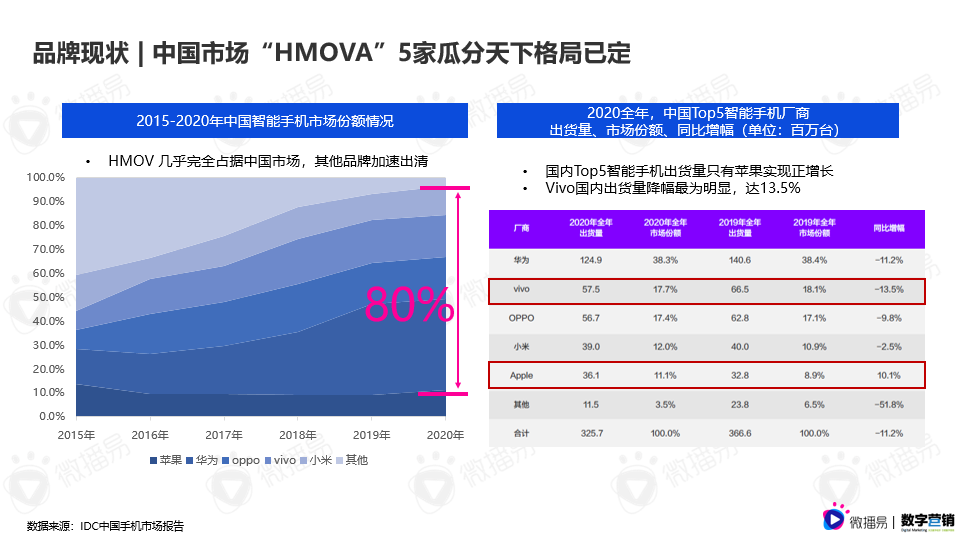 比拼屏幕、赶超系统、迭代新机、拓展概念?经历了十余年智能手机的发展,如今我国智能手机的行业格局稳定,形成了HMOVA(华为、小米、OPPO、vivo、苹果)五家瓜分天下的基本局势。有数据统计,截至2020年,我国智能手机市场中,HMOV(华为、小米、OPPO、vivo)以80%的市场份额几乎完全占据中国市场,国产智能手机厂商进入竞争空前激烈的新时代。