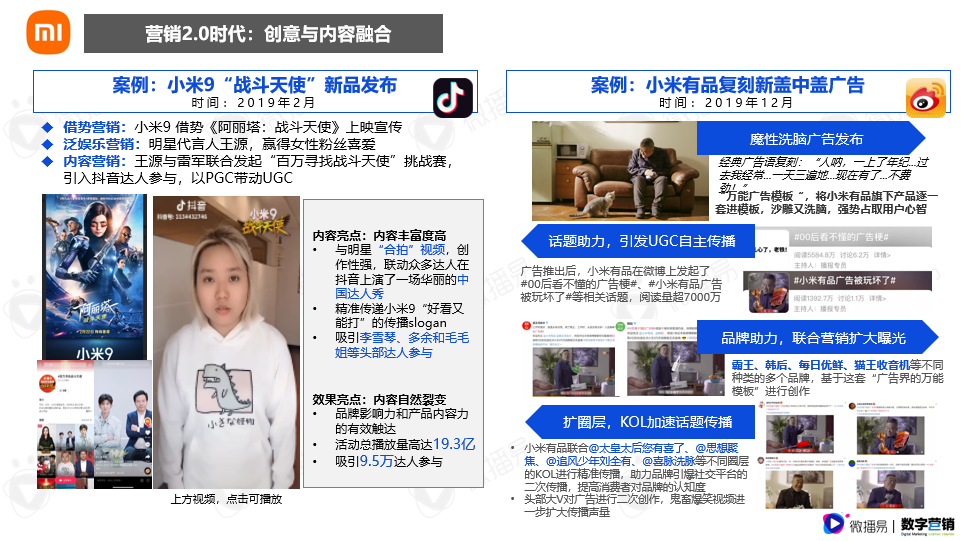 以小米9“战斗天使”新品发布为例,小米通过借势电影上映吸引粉丝注意力,再联合明星在抖音发起“百万寻找战斗天使”挑战赛,通过“合拍”视频激发创意,引入头部达人“喊话”小米,以PGC带动大量UGC实现内容共创,收获9.5万达人参与。