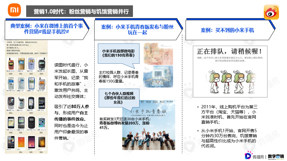 图文时代盛行,这一时代的小米将微博平台作为品牌对外营销的集结地。#我是手机控#首个事件营销让小米手机一战成名,吸引了近80万人参与,形成用户自主传播的事件效应。而小米手机开创的官网直销手机方式,让“买不到的小米手机”成为街头巷尾人们热议的话题,瞬间点燃小米品牌声量。