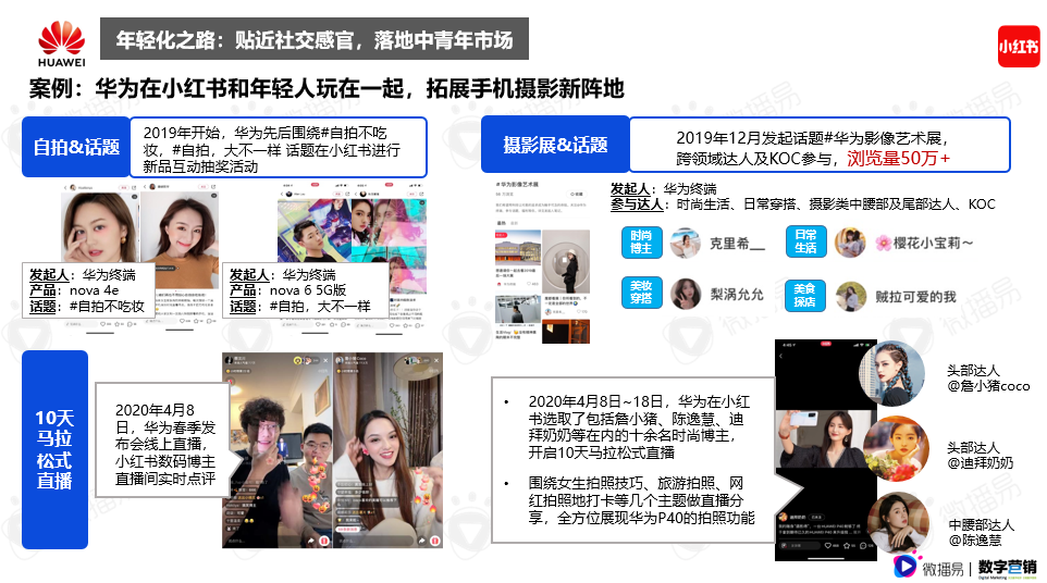 此外,2019年开始,华为将小红书平台拓展为手机摄影内容阵地,不仅发动摄影相关话题,还联合小红书数码博主开启直播,分享拍照技巧、旅游拍照等生活化内容,巧妙收割新晋父母、潮流新生代人群。