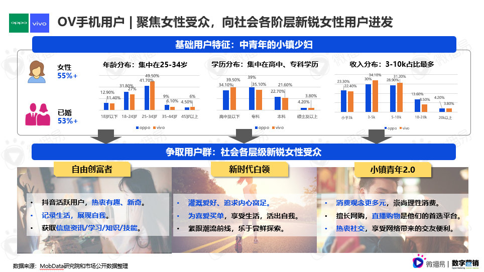 师出同源的OPPO和vivo,在用户画像上也十分相近,同样是已婚女性占比居多,同样是集中在25~34岁的年龄段,同样是学历较低、收入集中在3000~10000元之间,我们将OV的基础用户群体归纳为中青年小镇少妇。