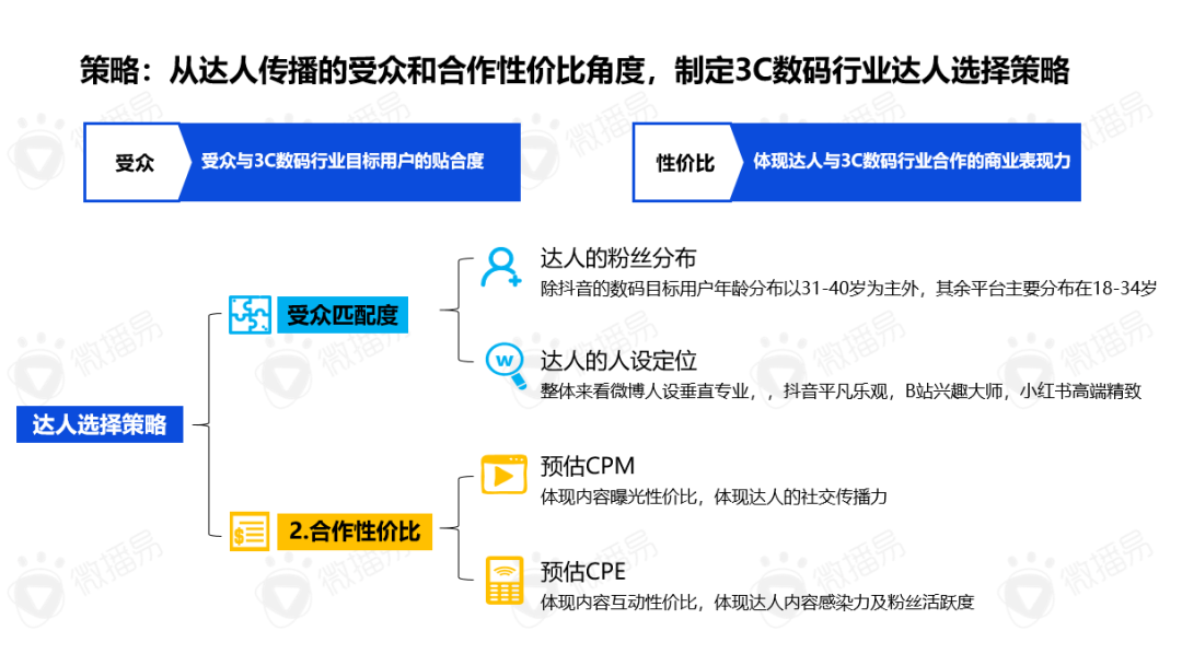 通过分析各社交媒体平台近一年与3C数码行业的合作趋势 ,总结微博、抖音、B站、小红书四大社媒平台的营销机会点,并从达人的受众匹配和合作性价比双维度,制定各平台的达人选择策略: