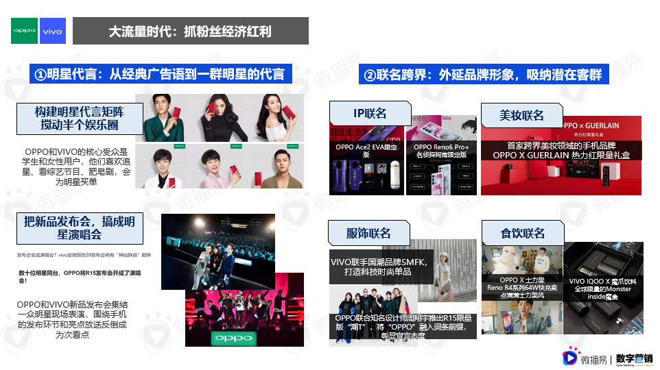不同于其他手机品牌有鲜明的粉丝属性,OV两家创立之初便占领流量粉丝蓝海,通过组建“明星家族”、冠名综艺影视,以明星效应拉动大批女性群体。同时,品牌不断外延形象,通过IP、美妆、服饰、食饮等多领域的联名活动,吸纳更多潜在客群
