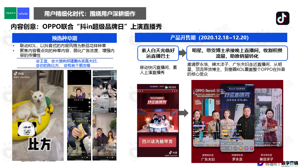 去年,OPPO联合“抖in超级品牌日”上演直播秀,预热种草联动不同类型KOL,以花样种草聚焦内容看点,增强内容传播性。在产品开售期,在抖音上演素人直播秀,并邀请罗永浩、辣木洋子、广东夫妇走进直播间,从明星、顶流带货博主到垂类KOL覆盖品牌核心受众。