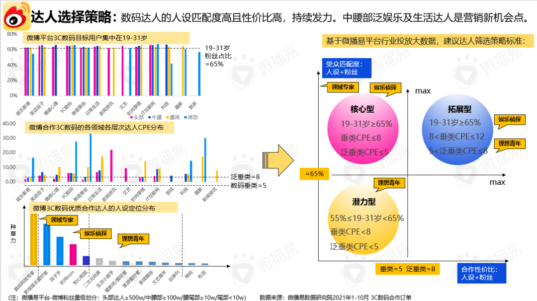 达人选择策略: 数码垂类达人的人设匹配度高且性价比较高,在营销中持续发力;中腰部泛娱乐及生活类达人是微博营销新机会。