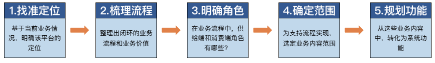 Ok,对齐范围之后。我们进入正题,营销平台搭建的思路应该是怎样的呢?我认为分为5步骤:找准定位、梳理流程、明确角色、确定范围、规划功能。