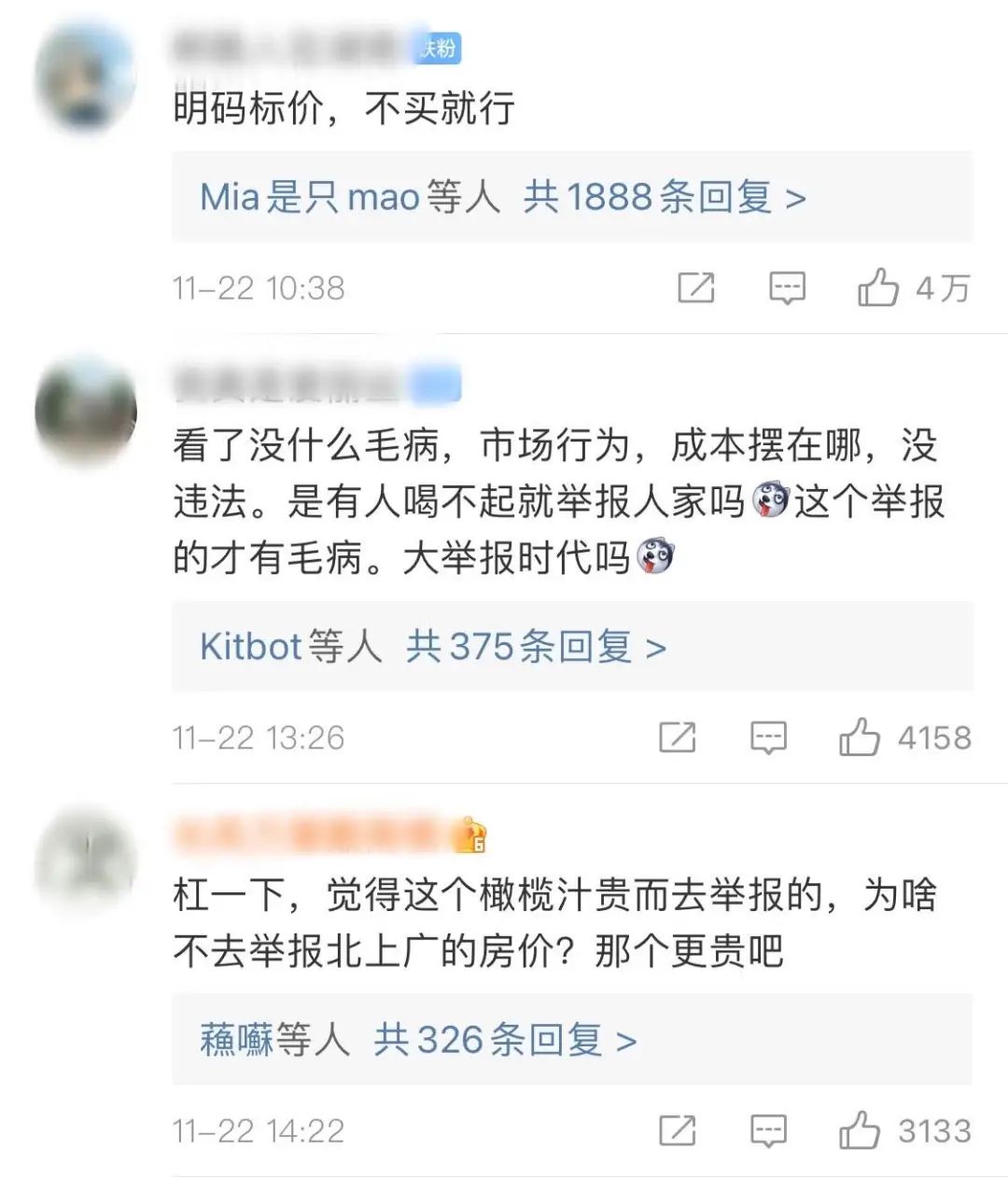 对于这款创下果汁饮品价格天花板的橄榄汁,虽单价突破了大众的印象,网友们的态度却并没有因此受到冲击,反而普遍持有“产品明码标价,不买就行了”的冷静观点。