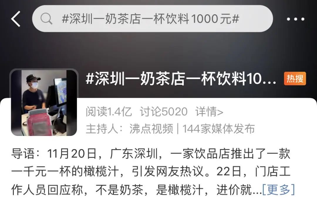 然而前段时间的一条热搜:#深圳一奶茶店一杯饮料1000元#,瞬间我格局炸开,不敢相信。