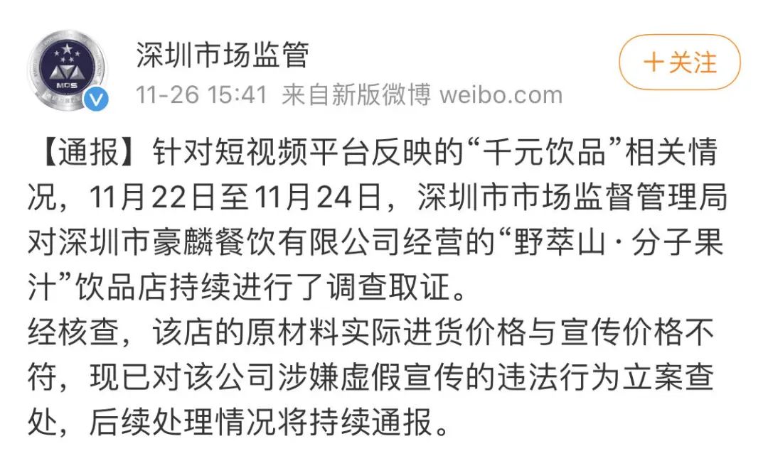 观众们不反感,但“千元果汁”的新闻却引起了深圳市场监管局的关注,通过调查取证核查,证实产品原材料实际进货价格与宣传价格不符,对野萃山涉嫌虚假宣传的违法行为进行了立案查处。
