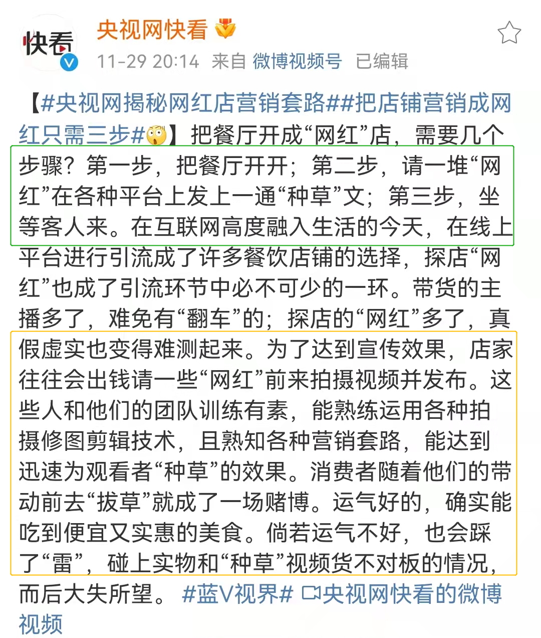 今天头条哥冲浪时候,突然看到央视网揭秘网红店营销套路。