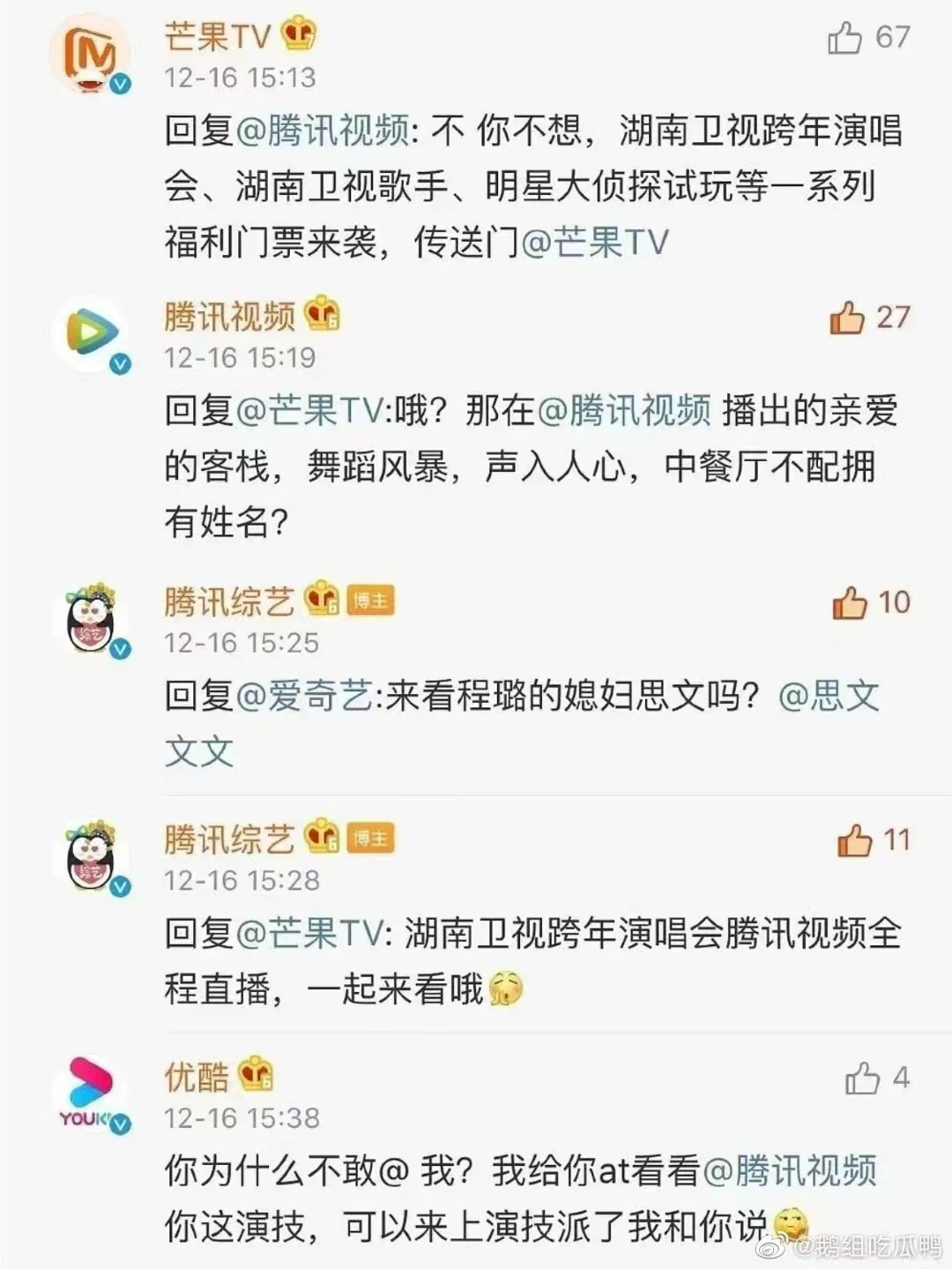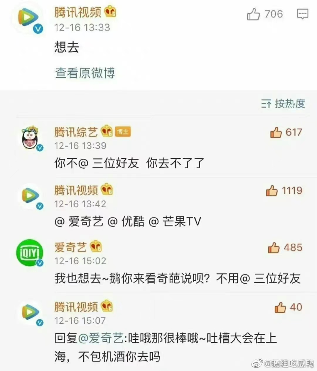 腾讯视频就麻溜地过来抽奖了,并@了它的三位 对手 好友爱奇艺、优酷、芒果TV,于是就有了下面这小学鸡的吵架对话: