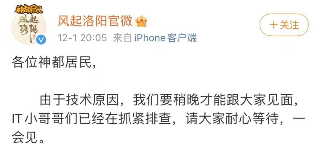 前天12月1日,爱奇艺的年底大制作剧《风起洛阳》开播了,原本定于晚上八点与观众见面的,结果海外版都开始播了,国内却因为技术原因,死活传不上视频,甚至还传错了视频...