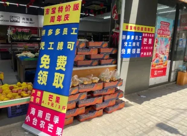 以及,在今年三月,淘特更是把自己庆祝周年庆的水果摊摆到了拼多多企业大楼楼下,称:“拼多多员工凭工牌即可免费领取”。