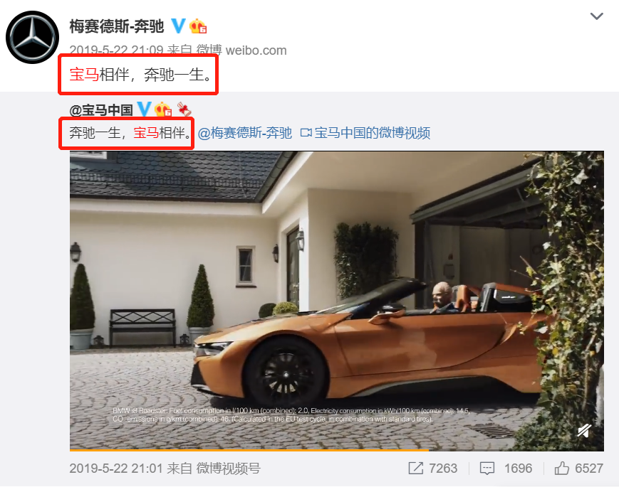 记得,19年 梅赛德斯-奔驰全球总裁退休时刻, 宝马第一时间送上了一支调戏意味的 广告片 , 并配文“奔驰一生,宝马相伴”。