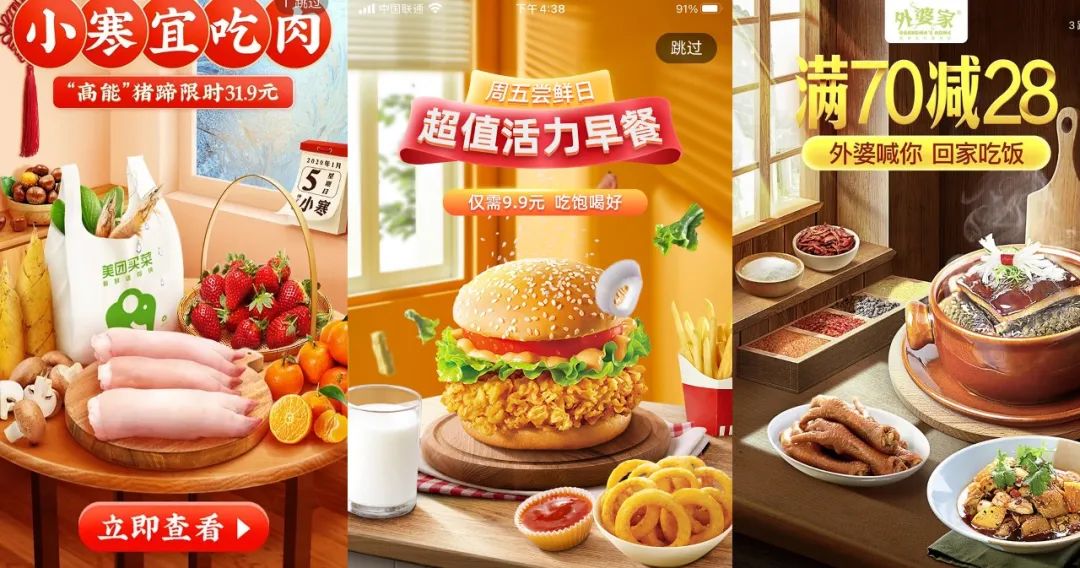 我们平时逛花瓣,可以看到各种生鲜类海报,比如每日优鲜,美团外卖,京东生鲜、饿了么等等。