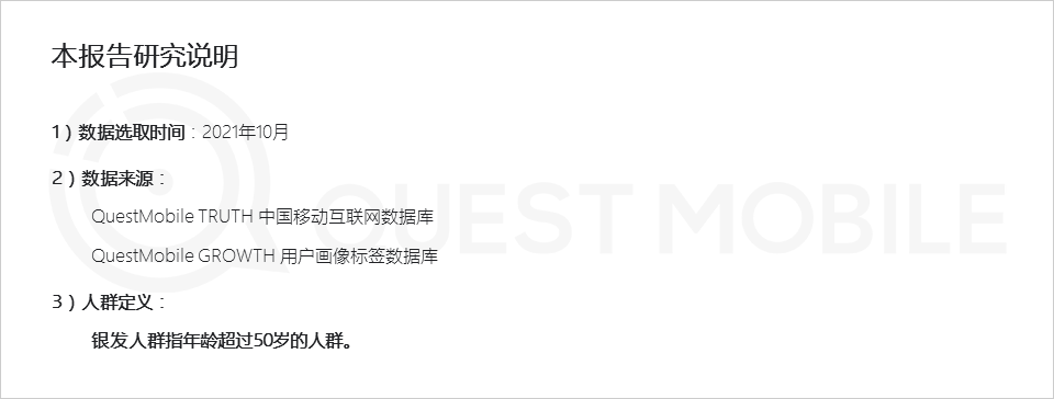 今天Mr.QM跟大家分享一下“银发经济”洞察报告。QuestMobile数据显示,截止到2021年10月,50岁以上移动网民月活用户已经达到2.51亿,同比增长了19.3%,月人均使用时长达到143.9小时,同比增长6.3%;从群体画像上看,银发人群中女性占比达到56.1%,显著超过了男性,从地域分布上,三四五线城市人群占比达到62.1%。