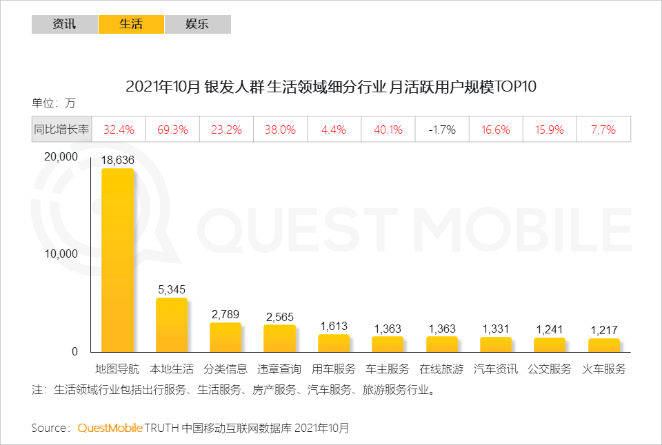 Mr.QM此前曾分享过,精细化运营是移动互联网的未来,银发群体的“全面线上化”就是其中的一个方向,成为存量时代突破发展的重要领域:过去一年,银发人群移动视频使用时长增长了7.7%,新闻资讯、移动购物分别增长了0.8%、0.6%,地图导航、本地生活、违章查询、车主服务等线上生活月活跃用户规模同比增长均超过30%,其中,地图导航用户渗透已经突破1.86亿。