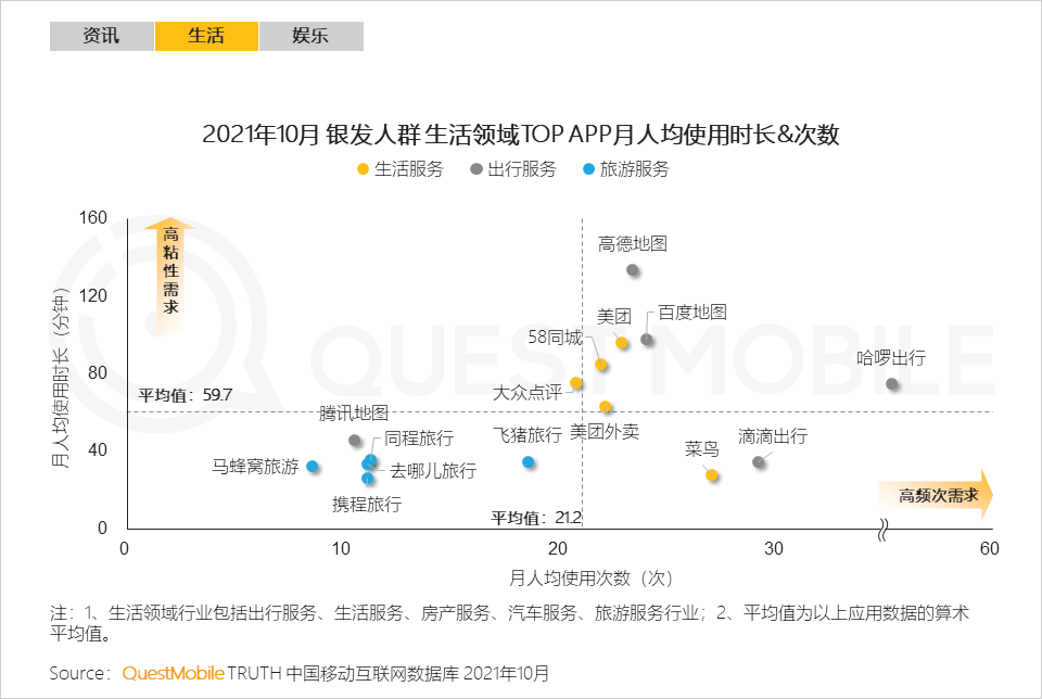 7、不同的服务类型形成明显的需求差异,银发人群在快递物流、用车服务使用频次更高,在本地生活、出行导航使用粘性更强