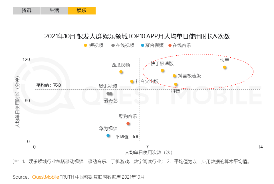 10、娱乐类应用中,银发人群对于短视频平台同样具有较高粘性,头部应用占据明显优势