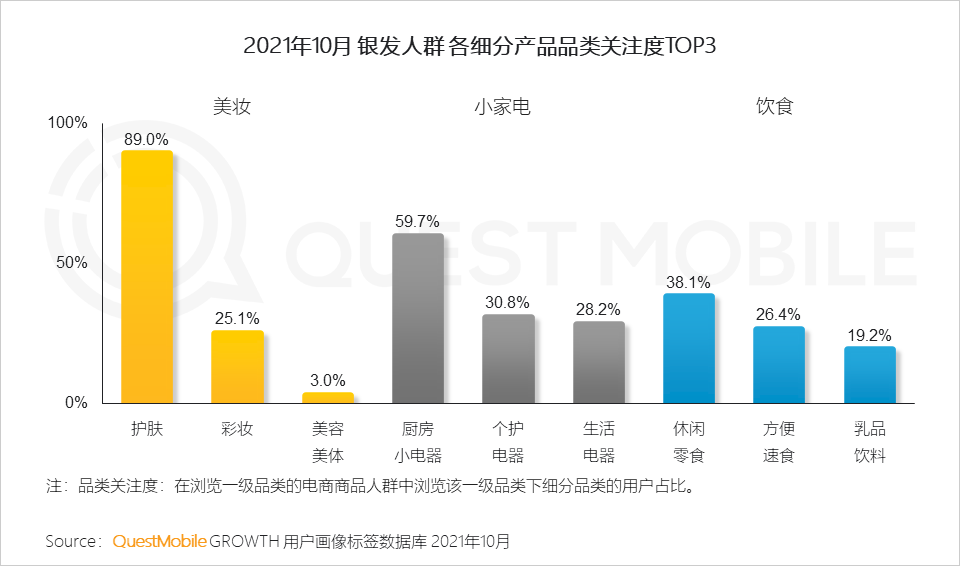 QuestMobile数据显示,银发人群在美妆类产品偏好中以护肤为主,小家电偏好则相对多样,全面覆盖料理、护理、家居等各个方面,饮食则一定程度反映家庭需求。