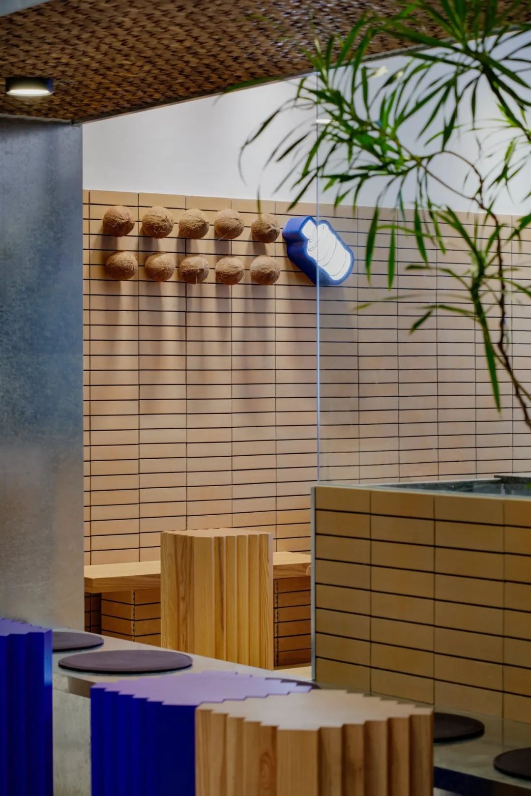 蔻蔻椰门店大多以极简风为主,而空间内的设计亮点有两处:一是将整颗椰子放置在空间内做装饰,强调品牌属性,同时展现原料的新鲜。