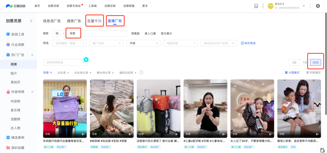 巨量创意是官方平台,输入自己类目的关键词可以直接看到同行竞品的素材形式和跑量模版,可以借鉴同行分析同行,然后按照咱们上述的方式进行批量化产出测试。