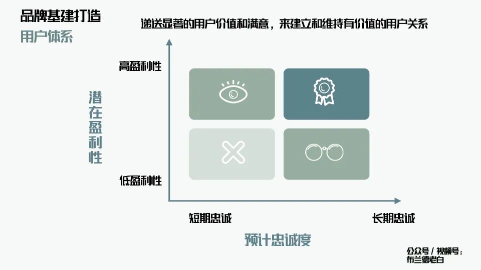 所以一定要谨慎地管理用户权益,把用户视为资产,与恰当的用户建立恰当的关系。品牌可以根据潜在盈利性将用户分类并相应地管理。高盈利性但不够忠诚的用户可以运用促销手段吸引他们,充分获取其价值。忠诚度高但低盈利性的用户,可以通过向他们出售更多产品、提高价格或减少服务,也许能够提高针对他们的盈利性,即使不能为品牌带来巨额利润,也可以扩大销售规模。最需要重视的是那些高盈利性且长期忠诚的用户,品牌私域的重点运营对象就是这些用户。品牌需要进行持续的取悦这些用户,并培养、留住和增加他们,甚至把他们从品牌的朋友变成品牌的信仰者,这样他们不仅经常自身购买还会将自身的良好体验分享给他人。