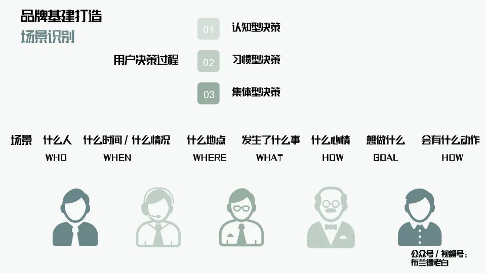 用户购买的决策过程,大体可以分为认知型决策、习惯型决策和集体型决策,其中前两种类型主要针对个人用户。认知型决策过程分为五个阶段:确认需要、搜索信息、评估备选方案、做出购买决策以及购后行为。购买过程从用户确认某一个问题或者某一种需要开始。需要可能是内部刺激引起,当一个人的基础需要比如饥饿强烈到某种程度时,就变成了一种驱动力。需要也可能由外部刺激引起,这也正是品牌应该重点进行研究的,要找出用户问题、需要以及产生的原因,以及如何引导用户关注自身的品牌产品。重点在于外部刺激需要从恰当的场景切入才能更好的激发需求,场景会让用户更有代入感。另外人们做出的很多决策都是协作性的,集体型决策通常包括两个或以上的人参加,这些人对结果有不同程度的贡献。集体型决策中包含以下几种身份:发起者是提出购买需求的人,影响者是能够对最终购买产生影响的人,决策者是能够控制决策结果的人,购买者是实际购买的人,使用者是真正消费产品或服务的人。从场景切入也是最容易将所有决策参与者都代入的方式。