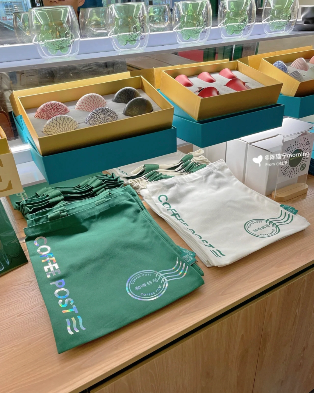 除了咖啡以及中国邮政正常的业务提供,店内还陈列了文创产品。以LOGO元素以及配色为主作延展设计,包括特色杯子、帆布袋等产品。