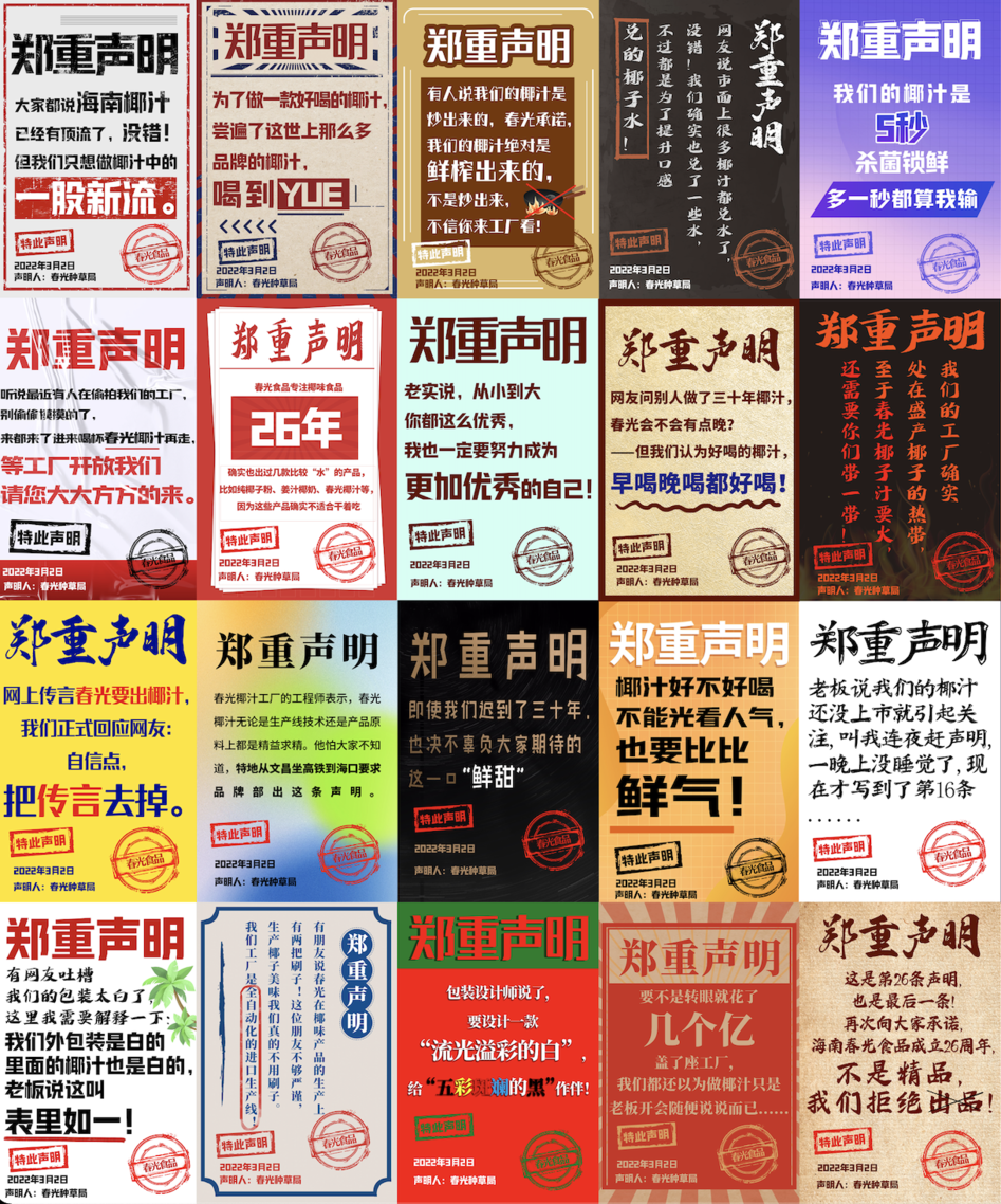 3月2日,春光食品官方微信连发26张“郑重声明”的海报,正式回应此事,并公开调侃,引起围观。