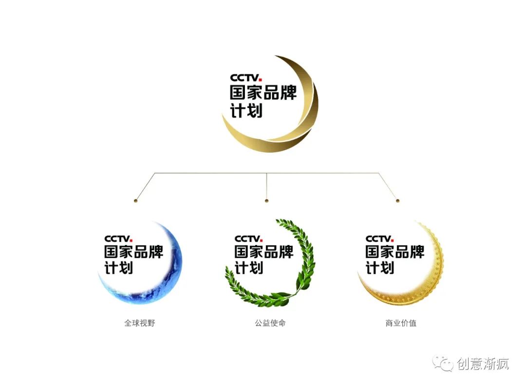 被金色月牙所环绕,“CCTV国家品牌计划”字样位于logo的中央,以清晰地标明计划名称。在中文字体设计上,在传承央视原有视觉体系与色彩的基础上,在造型上做了细微调整,与图形搭配更加和谐又不失新意。