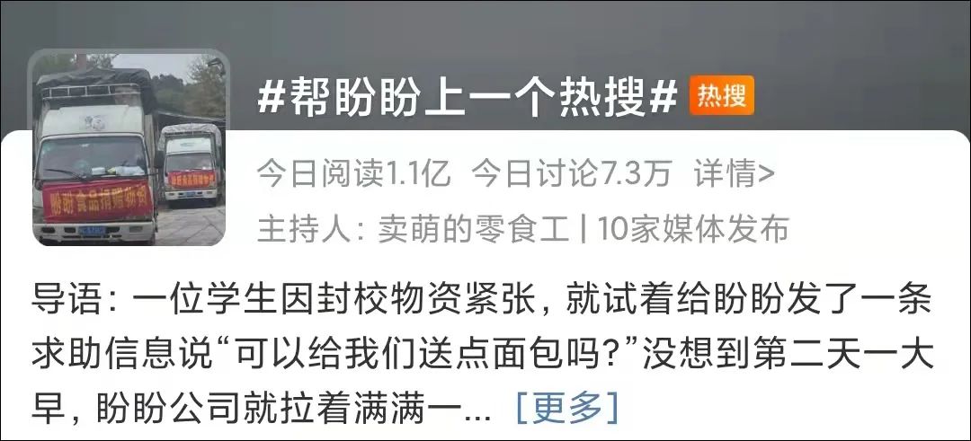 这次为学生捐物的热搜,盼盼相对低调,出圈是意外之喜;在之前的冬奥会中,盼盼是高调示人,出圈是意料之中。