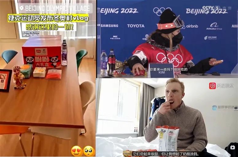 而在捷克运动员拍的冬奥村初体验vlog中,盼盼零食也华丽出镜了。