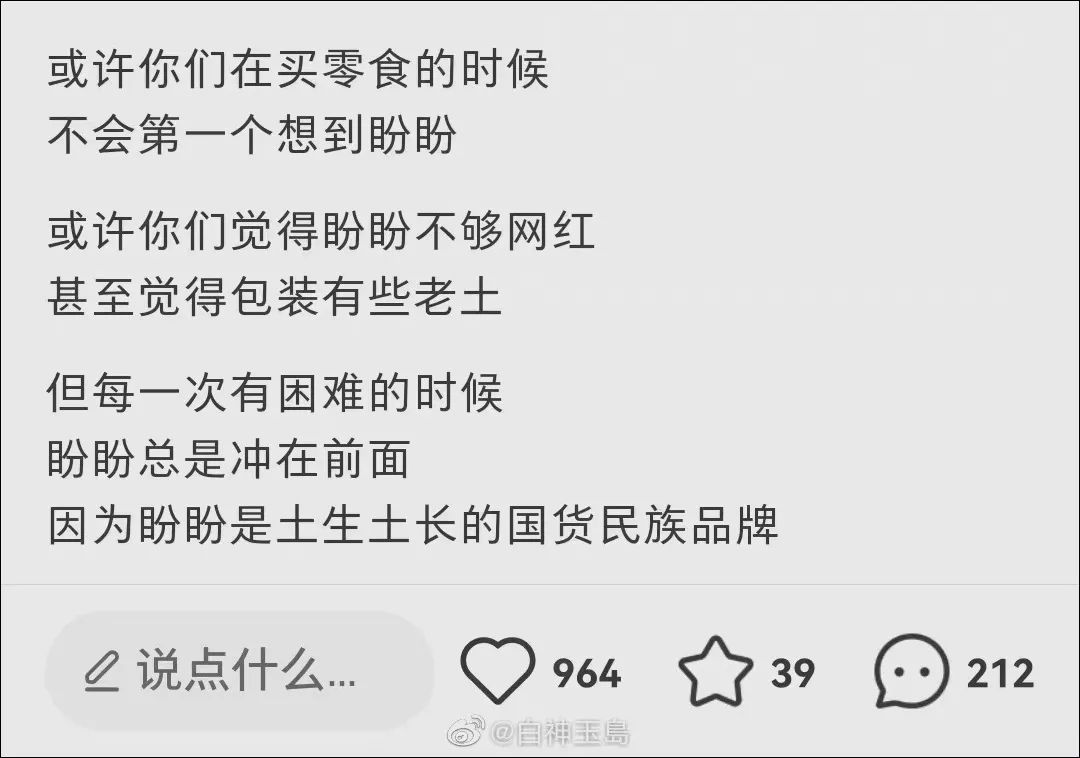 或许你们不买盼盼的零食,觉得盼盼老土,但有困难时我都冲在前面,因为咱是民族品牌!