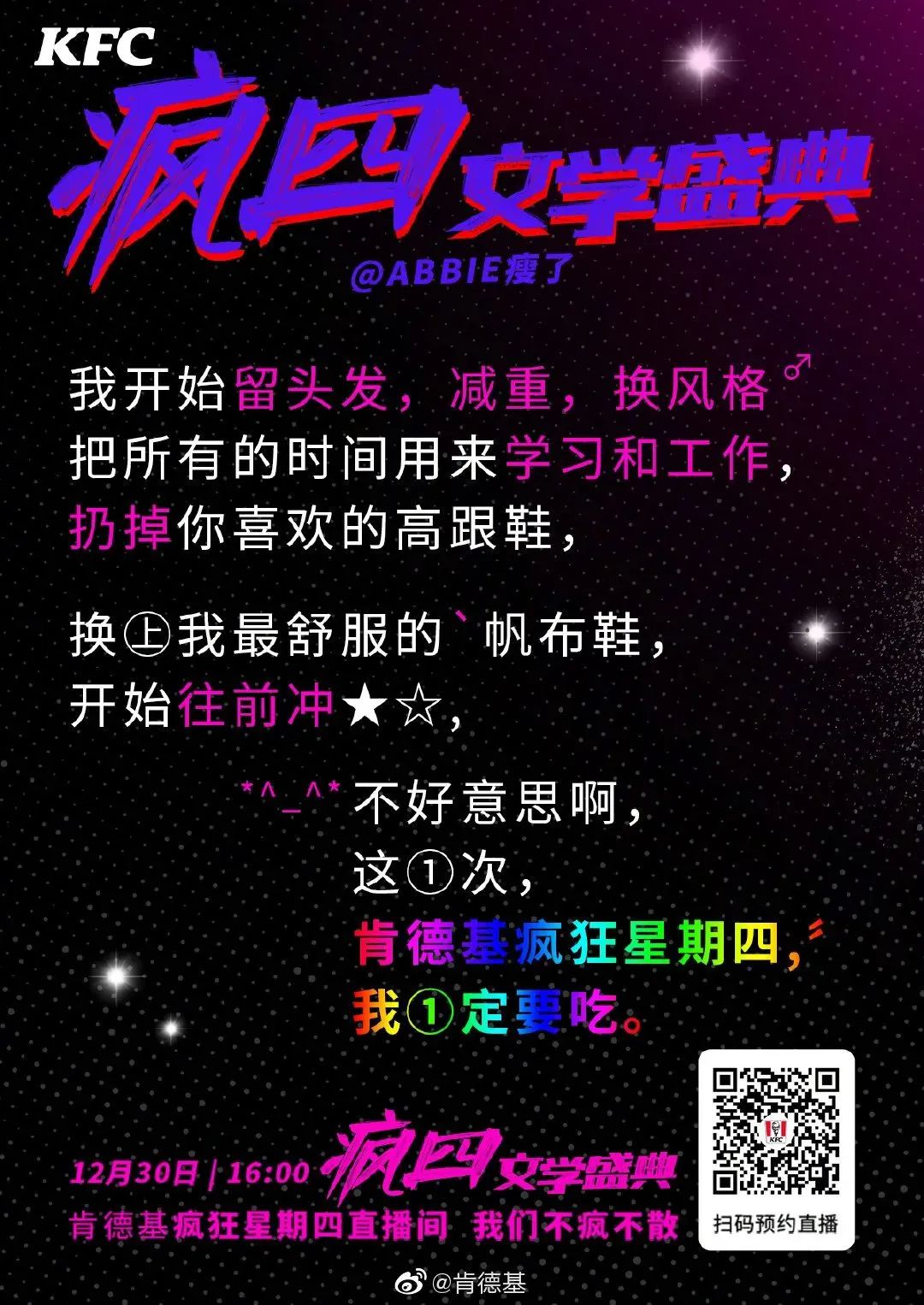 其实在此之前,肯德基疯狂星期四的文案已经成功火了一把,为了激发用户的创作热情,肯德基将话题有关的优质文案做成了海报被称为疯四文学盛典,并发起了全网原创疯四“文豪”的活动,表示有神秘大礼相送。