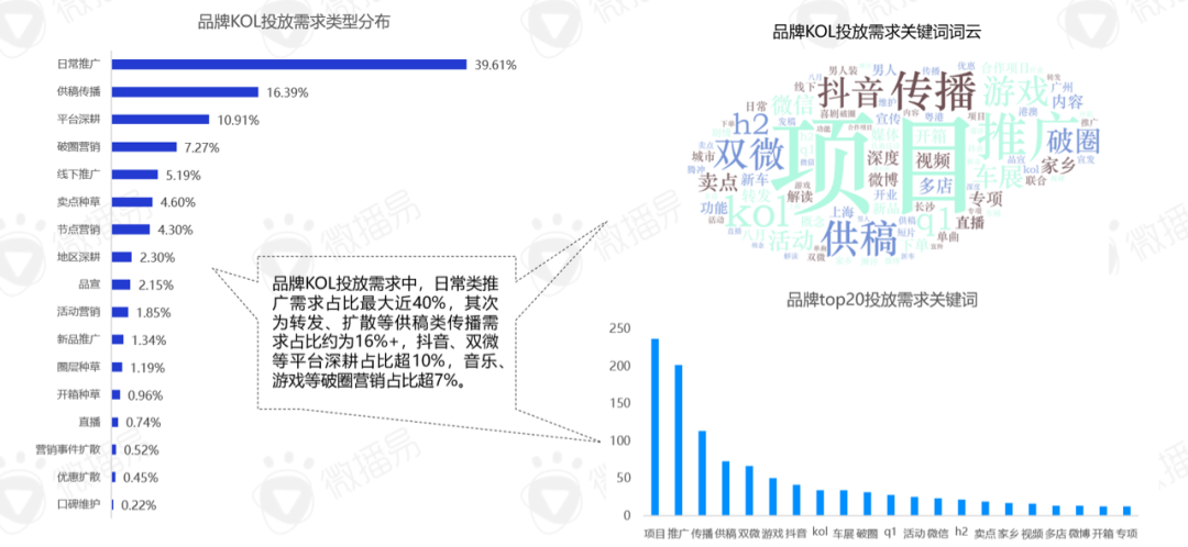 微播易交易平台数据 显示,品牌推广需求中日常化推广占比最大近4成,其次为转发、扩散等供稿类传播需求,占比约为16%+,抖音、双微等平台深耕占比超10%,音乐、游戏等破圈营销事件仅占7%。