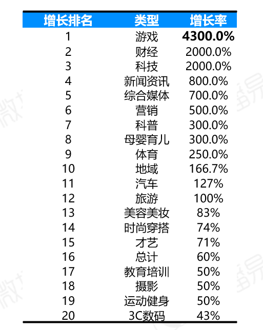 从增长角度看,游戏类账号投放数量增长率最大为4300%、财经和科技类账号增长2000%。