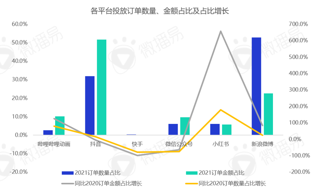 另外,新浪微博量级占比最大为52.8%,抖音吸金力最强占比为51.7%,小红书增长最快投放金额增长超658%,快手、微信两平台数量金额双双减少。