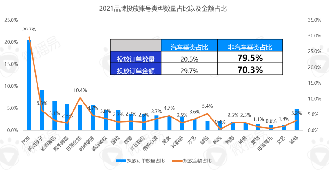 微播易交易平台数据显示,2021投放订单数量汽车垂类仅20%,投放金额为29%,其余为跨垂类账号,涉及笑话段子、新闻资讯、娱乐影音、时尚穿搭、美容美妆、游戏、旅游、IT互联网、情感心理、才艺等各类型账号。