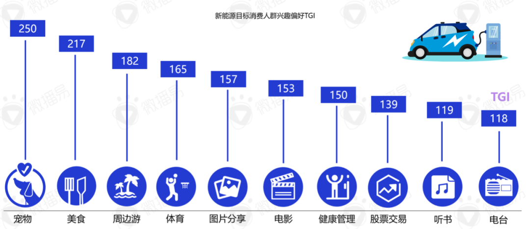 新能源汽车目标用户兴趣多元广泛分布,爱车更爱生活,对宠物、美食、旅行、体育等兴趣浓厚。