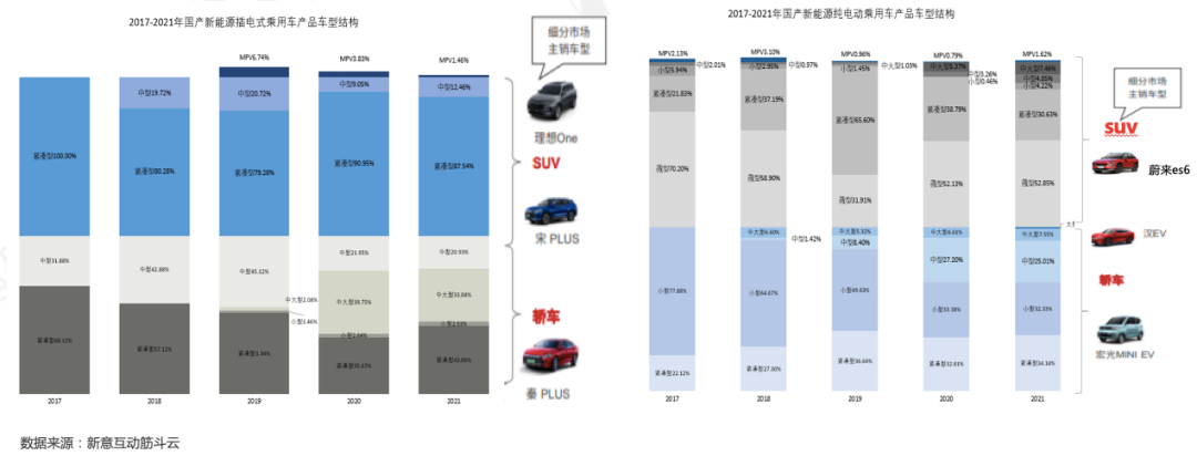 新能源市场大环境风起云涌,而车企和消费者的情况也在变化,新意互动筋斗云的数据显示主流的纯电和混电两种新能源车系,从2017年至2021年,随着国内自主品牌技术逐渐成熟,车型更加丰富,从轿车品类来看,中大型和大型轿车的上市,正在不断满足市场多元的需求。