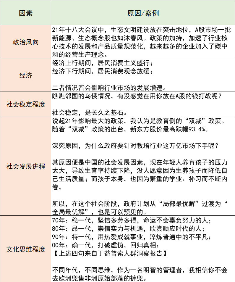 宏观的商业思维是基于所处地区的社会大环境的全方位考量,支持性政策对组织发展起到促进作用,那么限制性政策呢?带着问题,大家可以看看下图的随笔(思考向-不作参考)。