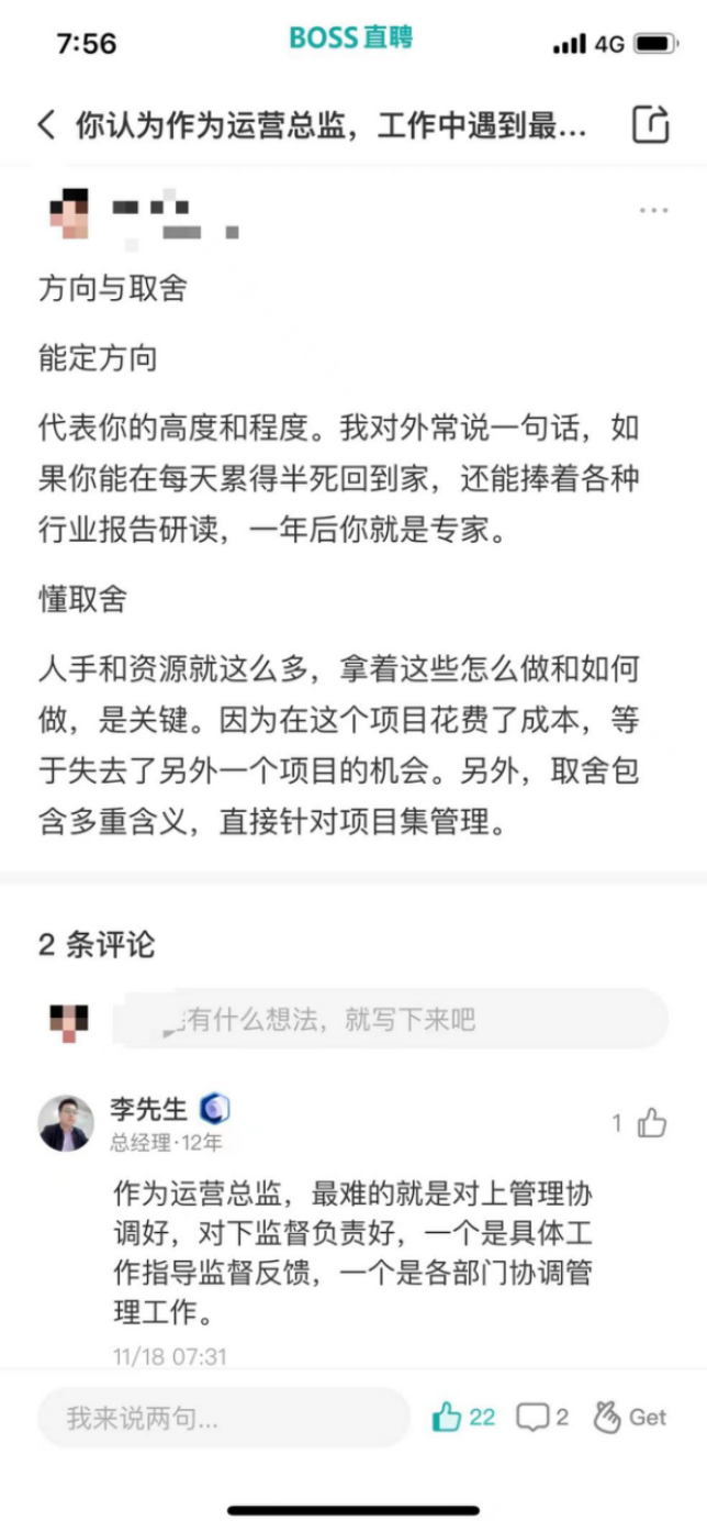 下图是橘先生去年在Boss直聘社区板块的回答,问题是:你认为作为运营总监,工作中遇到最困难的问题是什么?