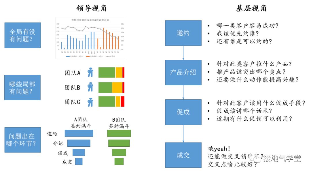 这里要特别强调对象的问题。不同人需要的赋能手段是不一样的,越是上层的领导,越需要总览全局的工具,才能看清形式,灵活调配资源。越是基层执行,越需要简单、直接、可复制的武器,直接套用在流程中。所以即使是同一个数据分析的结果,给上层和基层看,展现效果可能完全不同。