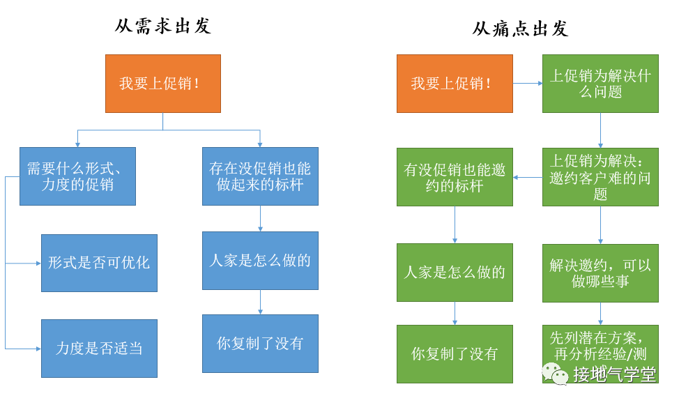 这种真假难辨、稀里糊涂的场面,又是数据分析大放光彩的时候。所以在讨论具体咋赋能之前,我们得先讨论清楚:到底赋能要解决什么问题。我们可以用两个方式转化问题:第一,从需求出发,推导可行解决范围,落实到一个具体问题上。第二,从痛点出发,先找到需求背后的真实痛点,再找解决痛点的方案。